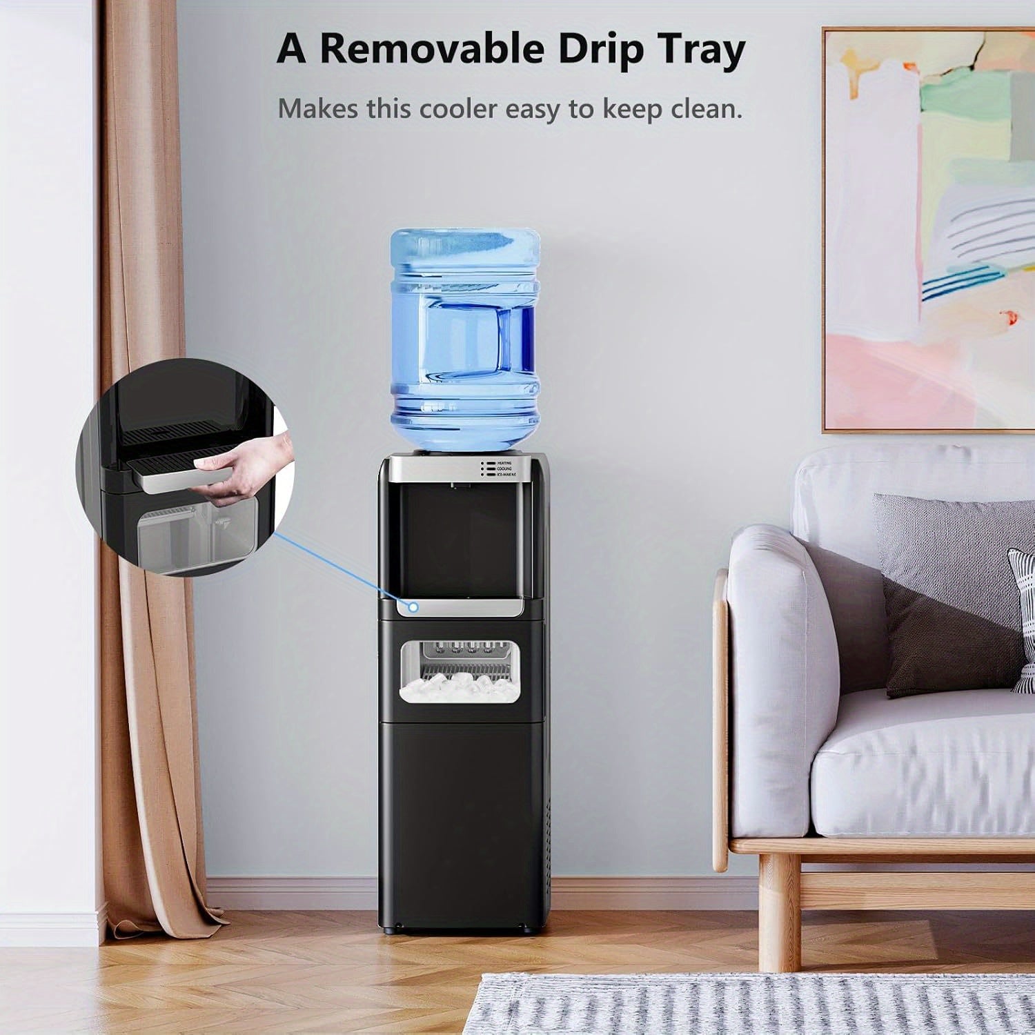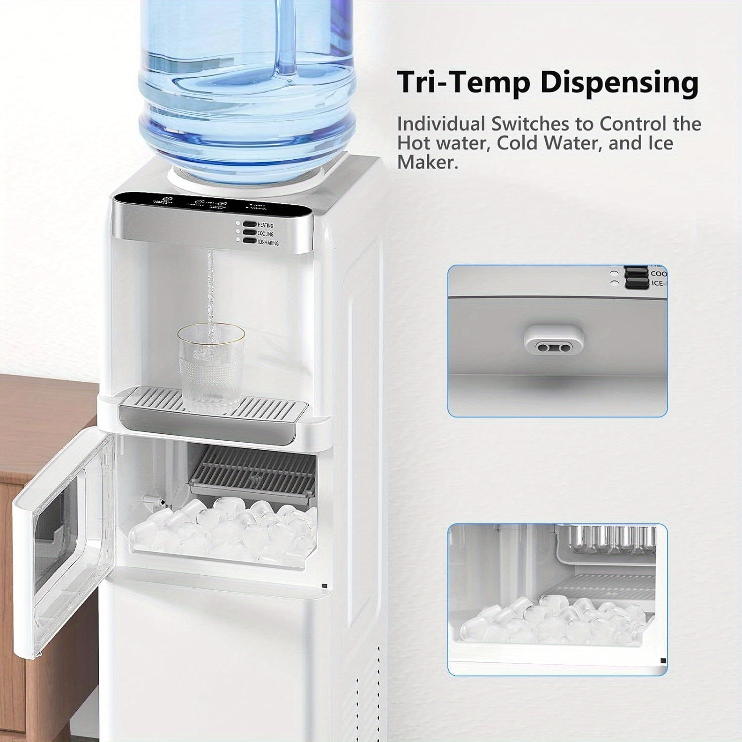 Hot And Cold Water Cooler with an Ice Maker Feature, Designed for 5-Gallon Bottles. It Has a Top-Loading Design And Includes a Child Safety Lock, Making It Suitable for Home, Office, Or Garage Use.